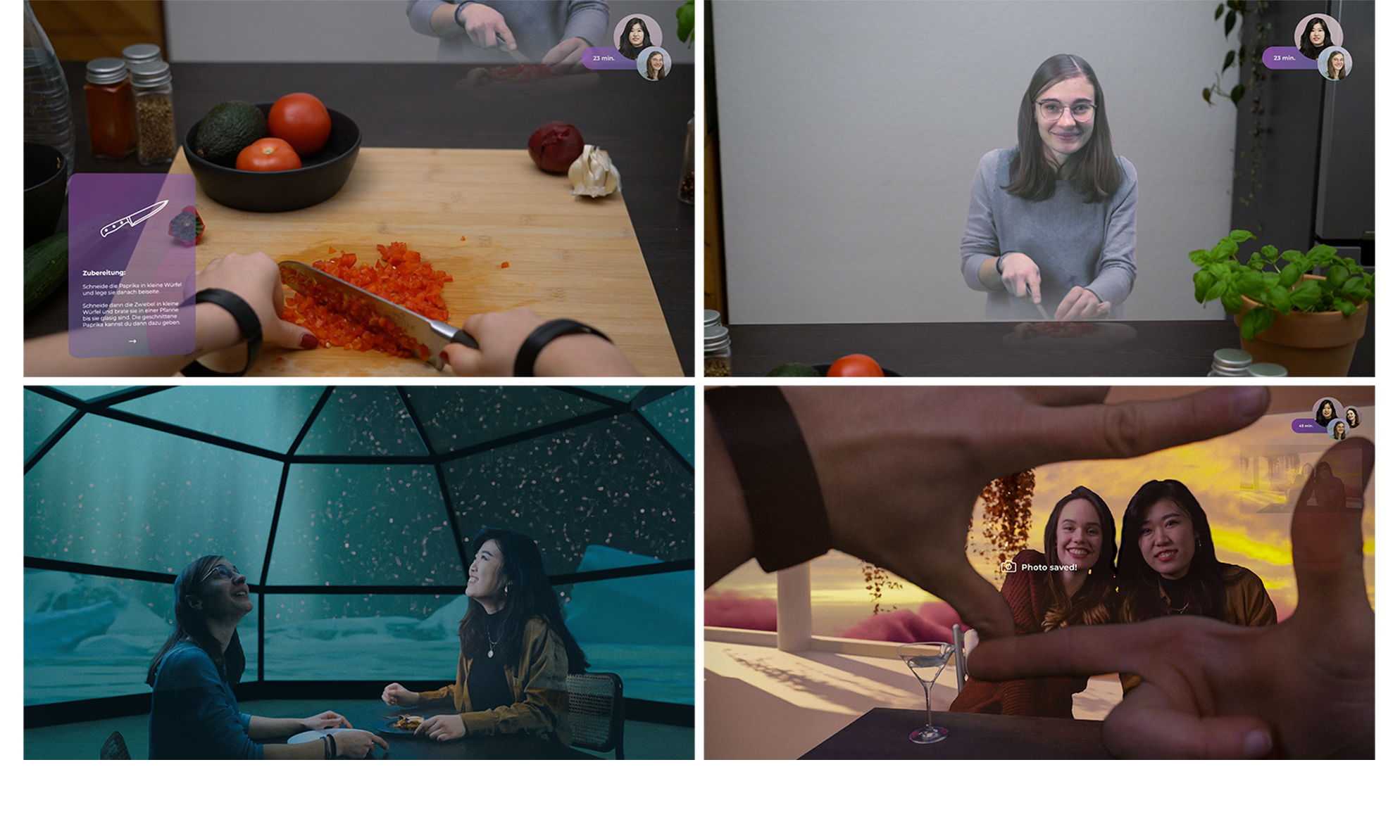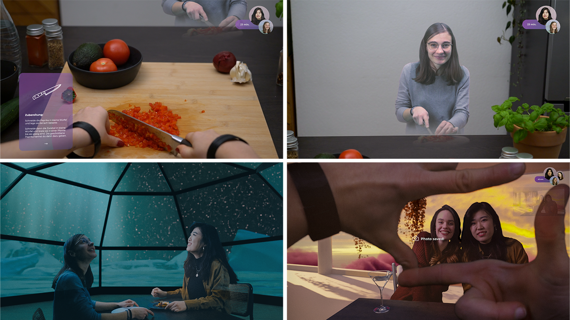Gemeinsame Aktivitäten wie Kochen oder Spaziergänge in AR oder z.B. gemeinsames Essen und Filme schauen in nutzerzentrierten VR-Räumen sind mit dieser Technologie nun möglich. Schöne Momente lassen sich mit einer einfachen Handgeste einfangen und als Foto speichern.