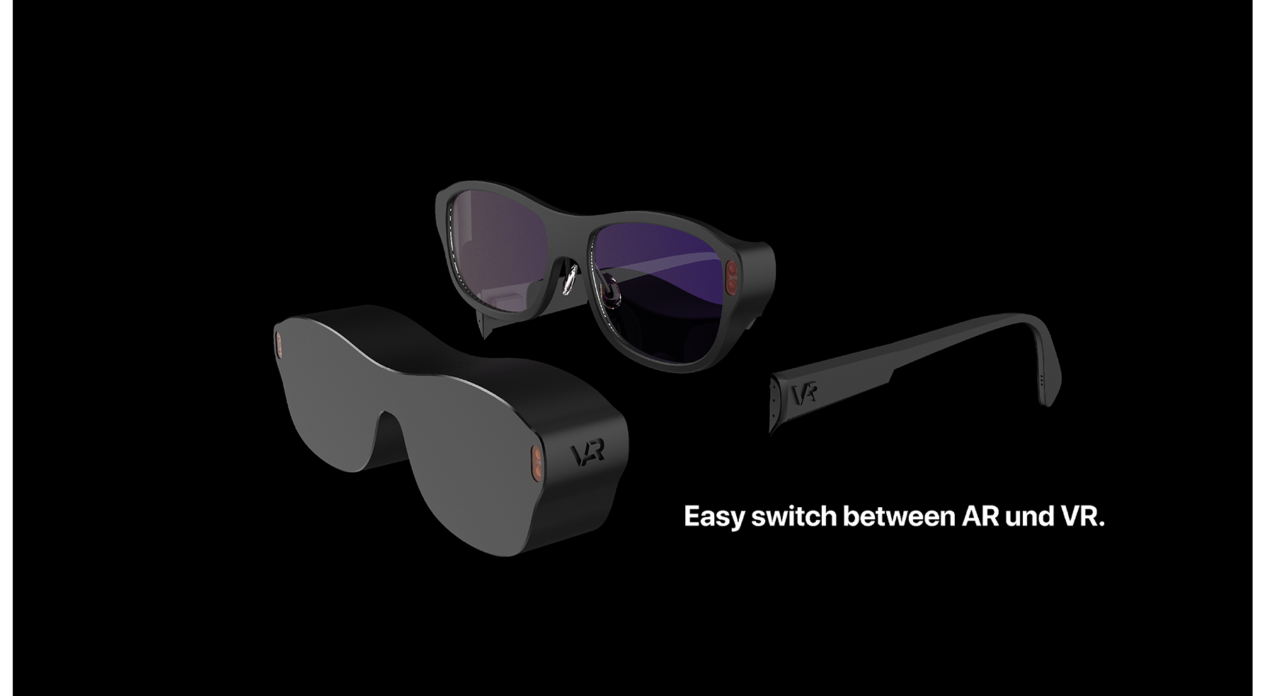 Unsere Hardware besteht aus einer modularen Brille, welche den Nutzer einen flexiblen und einfachen Wechsel zwischen AR und VR bietet. Durch eingebaute Sensoren in der Brille und in unseren Armbändern können die Mimik und Gestik des Nutzers übertragen und vom Gesprächspartner sowohl im realen als auch im virtuellen Raum gesehen werden, was zu einem äußerst immersiven Erlebnis führt.