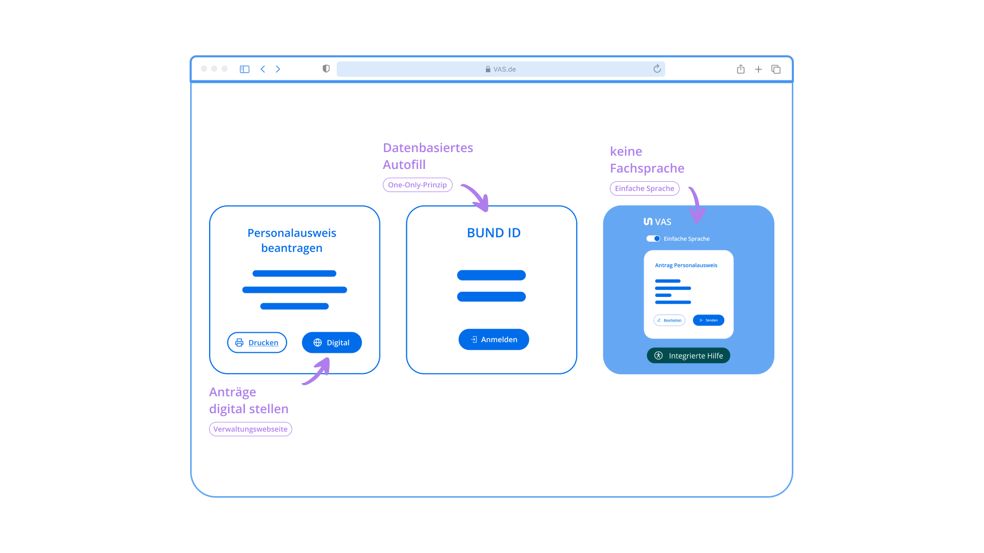 Eine Bürgerin besucht die Verwaltungswebseite ihrer Kommune, um einen Personalausweis zu beantragen. Durch das Pilotprojekt von VAS kann sie die digitale Antragstellung nutzen. Dabei meldet sie sich mit ihrer BUND-ID an. Der digitale Antrag liegt in einem standardisiertem Dateiformat vor als auch in Fachsprache. Für mehr Inklusion ist der Antrag auch in einfacher Sprache vorhanden. Dabei sind die Felder des Antrags bereits automatisch mit den hinterlegten Daten durch die BUND-ID vorausgefüllt. Der fertig ausgefüllt Antrag wird digital an die Behörde übermittelt.