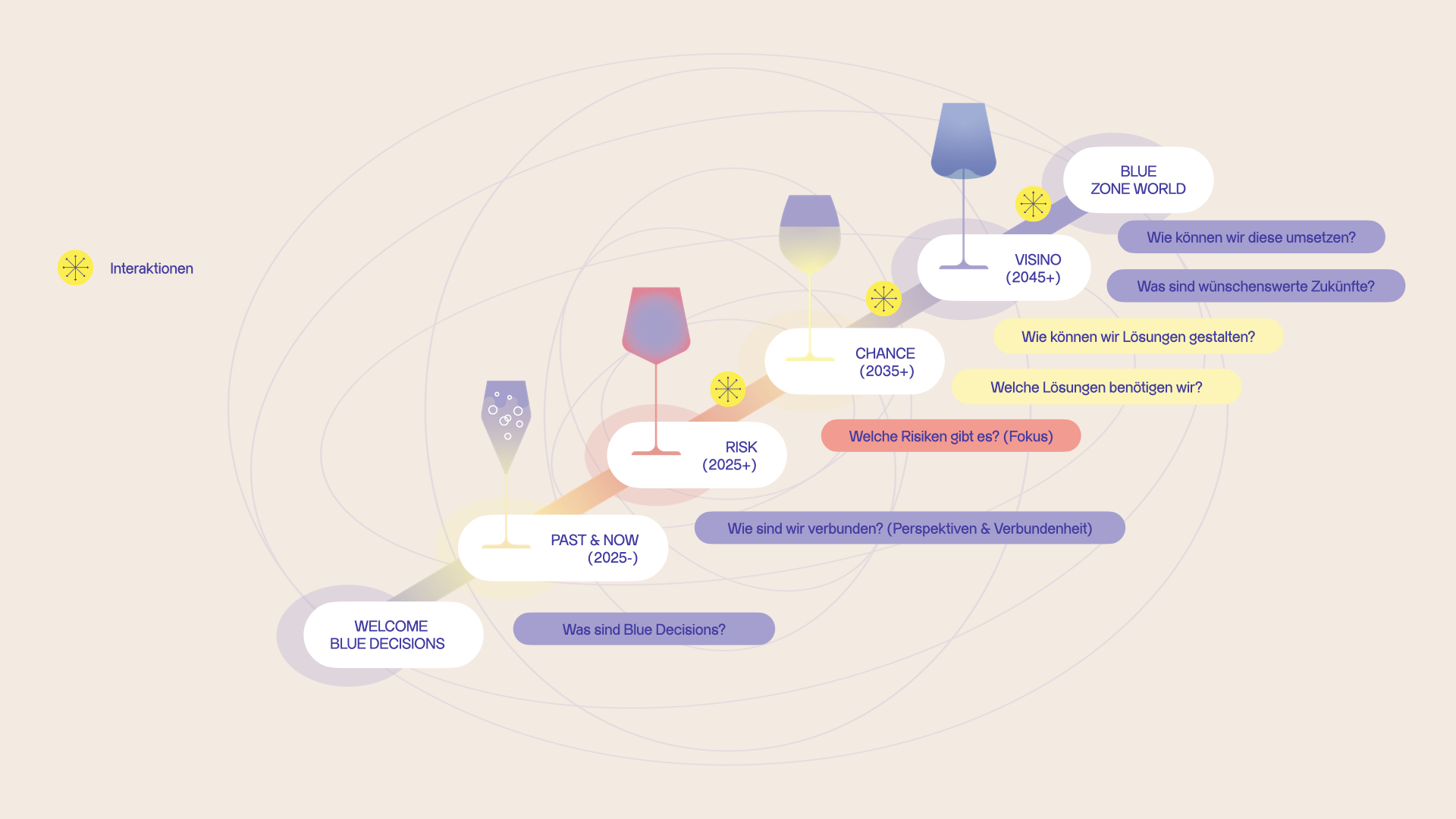 Methoden aus dem System & Futures Thinking dienen der Schaffung eines Bewusstseins und der Entwicklung wünschenswerter Szenarien und sind mit dem Weinanbau verknüpft. Weinanbau, Entscheidung, Klima, all das, was für einen besonderen Wein, auch bezeichnet als "Vintage", wichtig ist, verknüpft sich mit dem Gestaltungprozess von Blue Decisions. Die Interaktionen sind die Schnittstellen und verbindenden Elemente der Experience. Sie dienen dem tieferen Austausch und der eigenen Reflexion.