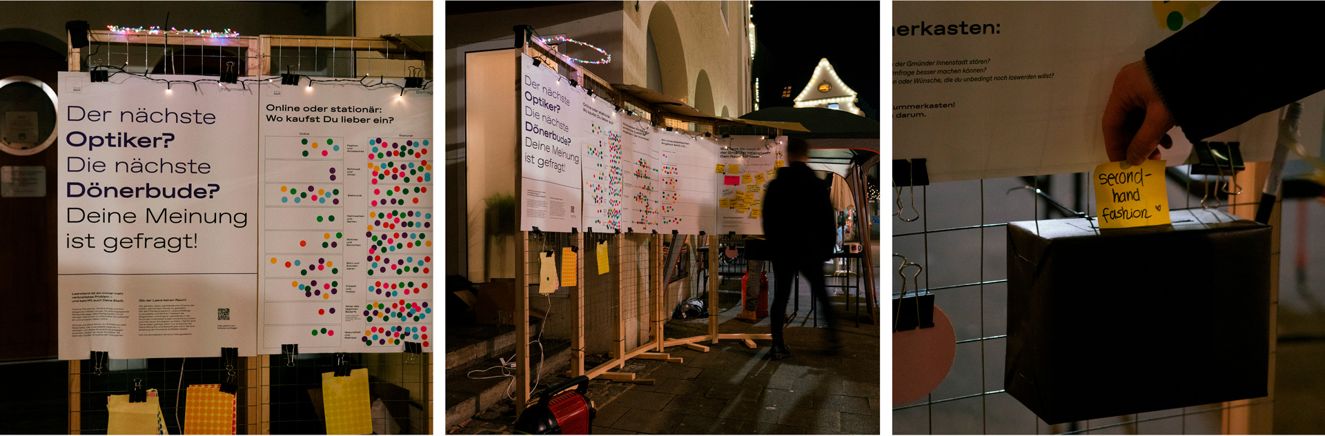 Während der langen Einkaufsnacht konnten wir spontan und vereinfacht die Idee des Weissraum-Hubs umsetzen und testen. Mithilfe eines Dot-Votings konnten die Passanten schnell und spielerisch Fragen beantworten. Ein Plakat bot zusätzlich Platz für eigene Gedanken und Ideen. Ein „Kummerkasten“ erlaubte es, Kritik zu äußern, ohne diese öffentlich präsentieren zu müssen. Durch diese Aktion konnten wir mit den unterschiedlichsten Innenstadt Akteuren persönlich ins Gespräch kommen und wertvolle Erkenntnisse für den weiteren Prozess generieren.