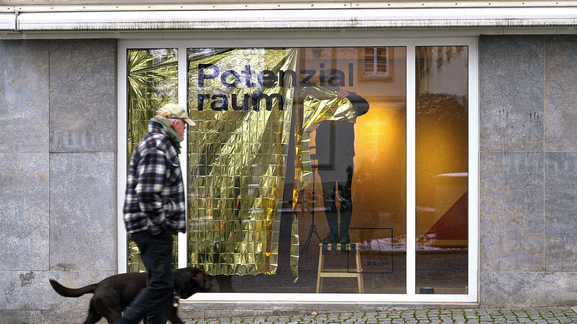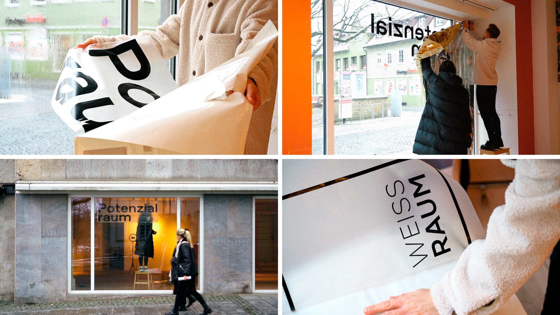 Weitere Schaufenster bespielten wir mit Gold und Silberfolien. So fielen die bisher wenig beachteten und unscheinbaren Schaufenster schon von weitem ins Auge. Texte wie "Potenzialraum", "Lebensraum" oder "Gemeinschaftsraum" machten auf das mögliche Potenzial der leerstehenden Ladenflächen aufmerksam und verdeutlichten außerdem potenzielle Nutzungsformen. Ein QR-Code verlinkte auf unsere Website und gab Interessierten die Möglichkeit, sich über diese und weitere Aktionen zu informieren und selbst aktiv zu werden.