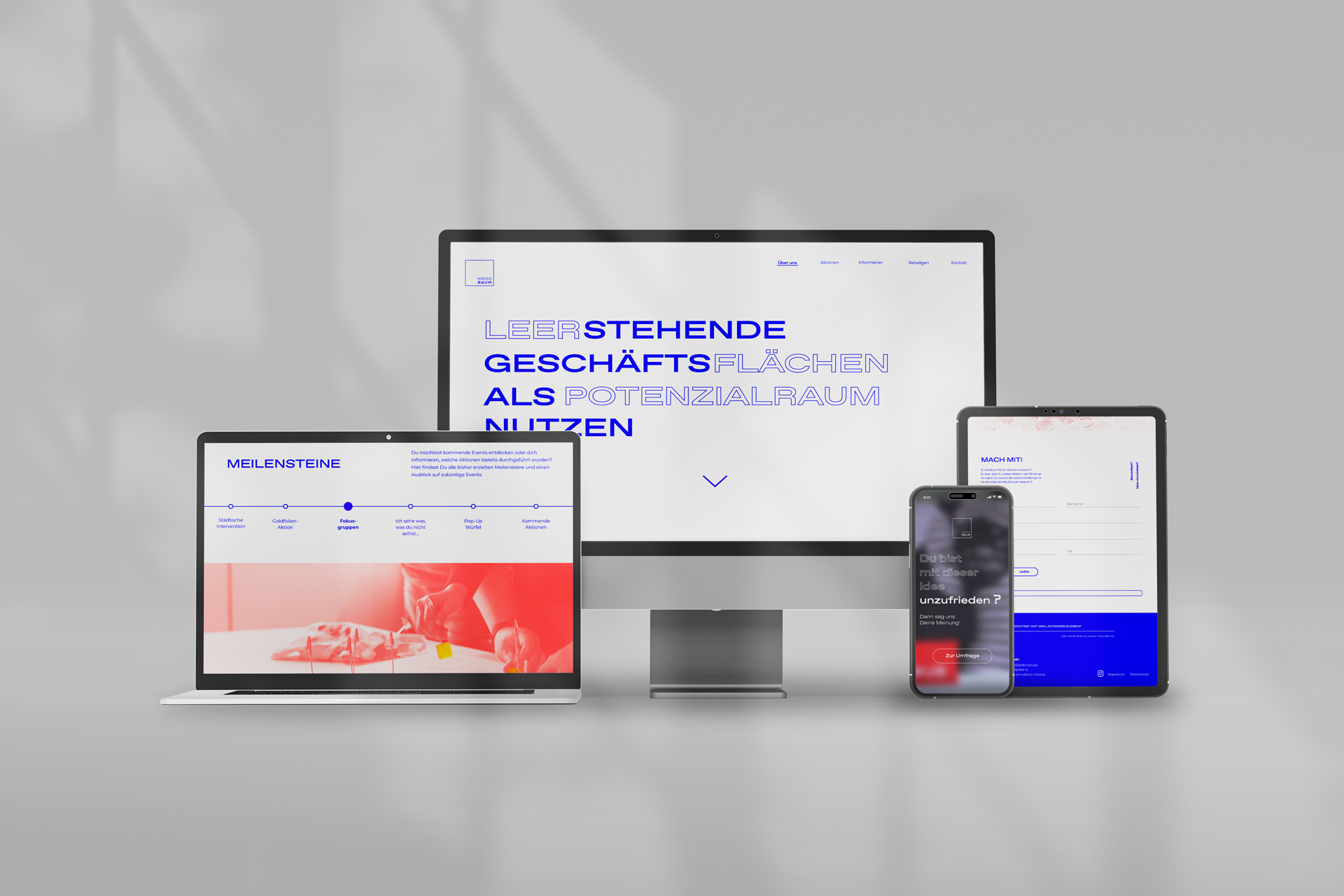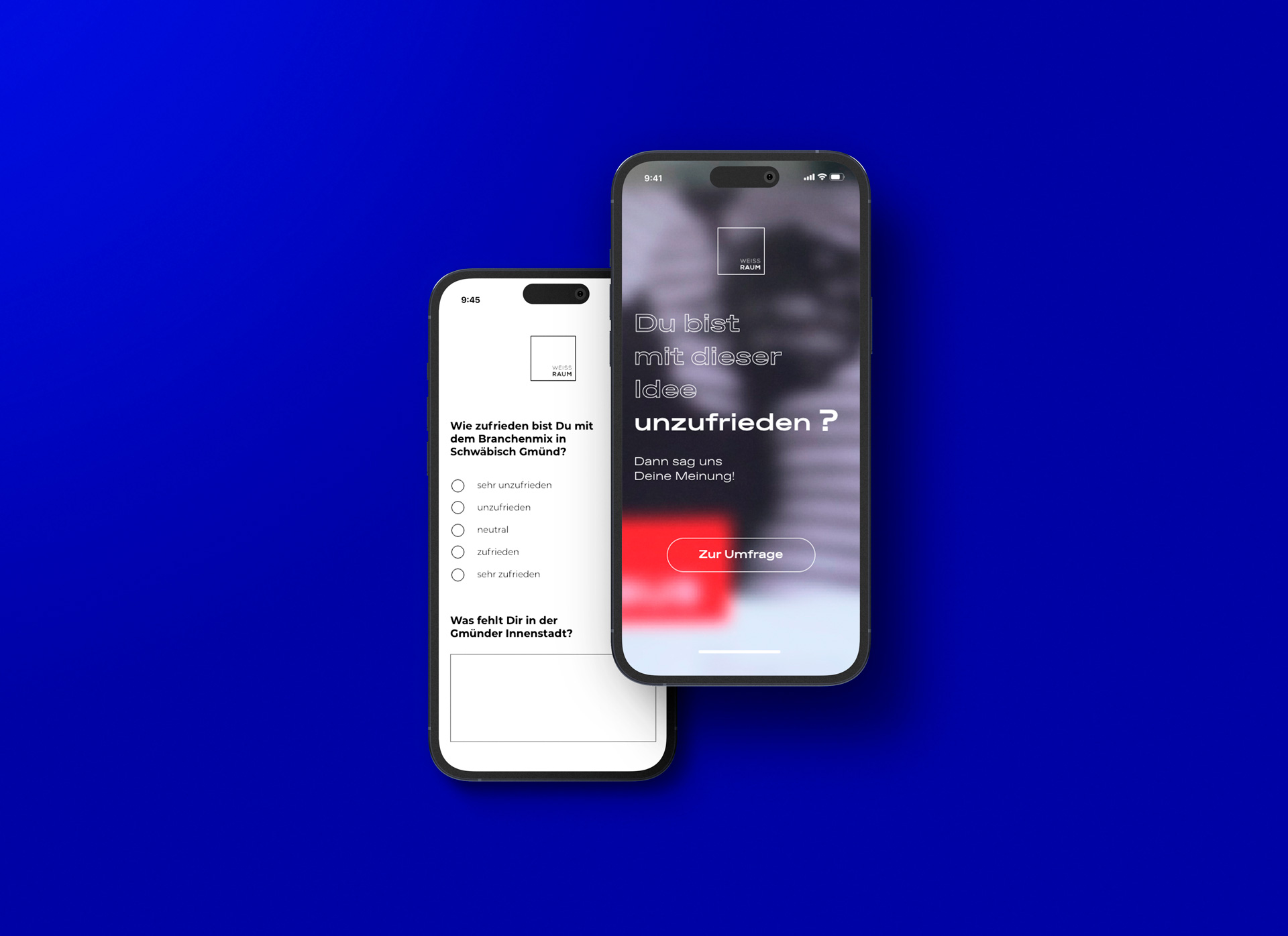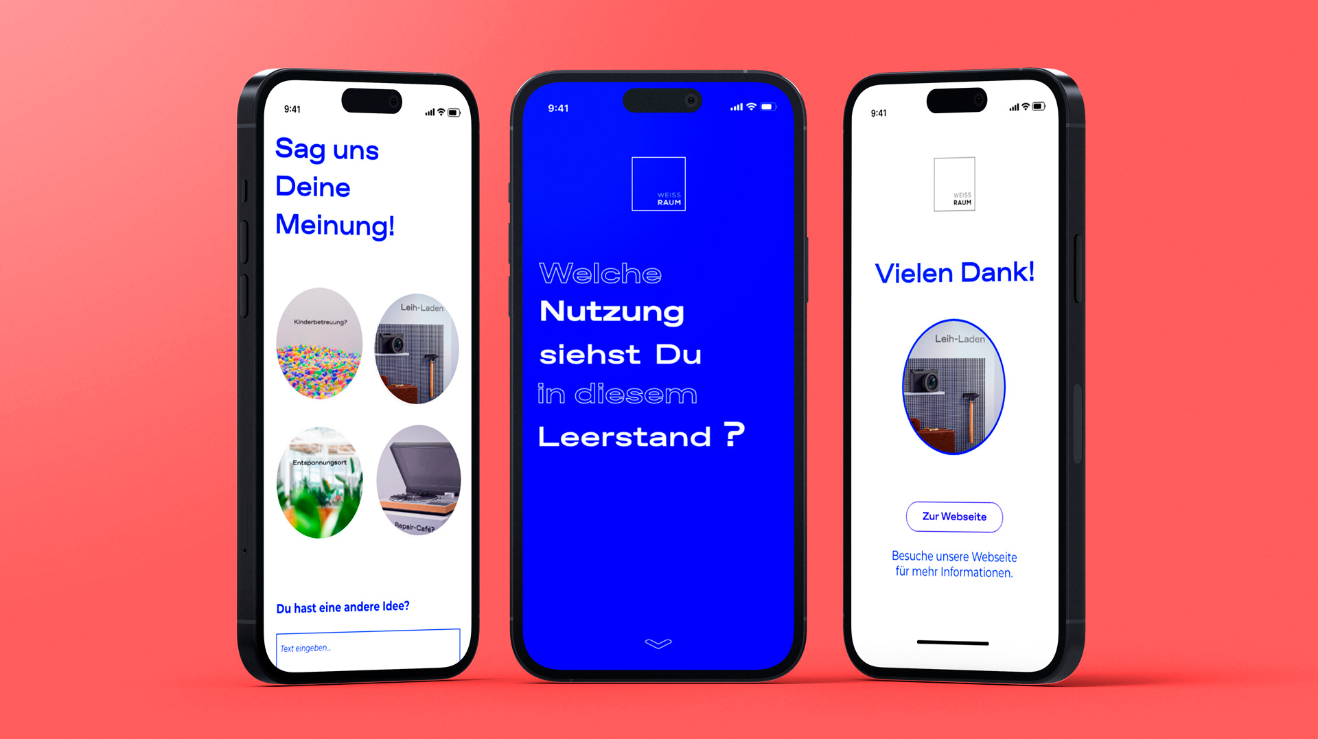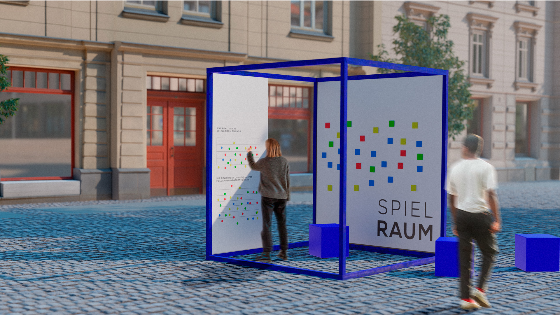Der blaue Würfel dient als Wiedererkennungswert für Weissraum und soll dafür genutzt werden, schnell und einfach Bürger vor Ort zu beteiligen. Mit kreativen und vereinfachten Nutzungskonzepten wird er außerdem ein Ort des Zusammenkommens und ermöglicht einen unkomplizierten Austausch. In Zukunft kann der Würfel an verschiedenen Standorten und Städten aufgebaut werden, um zielgruppenspezifische Insights zu erhalten.