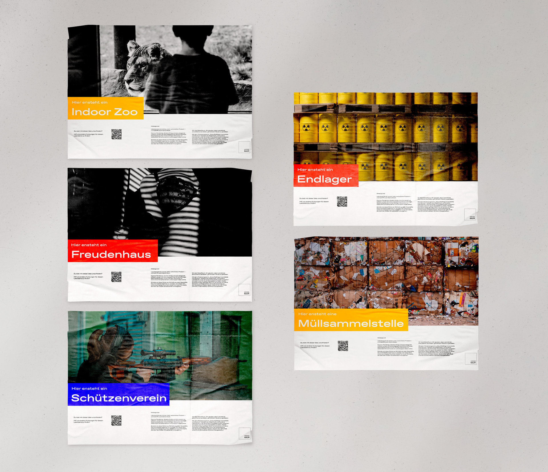 den allgemeinen Diskurs zu fördern, suchten wir nach einfachen und effizienten Methoden, um deren Interesse zu wecken. Dabei entschieden wir uns für eine gezielte Provokation der oft negativ gestimmten Bewohner. Diese orientierten sich an den Bautafeln, die in der Architektur verwendet werden, um zukünftige Bauprojekte anzukündigen. In plakativer Schrift wurden mit dem Slogan "Hier entsteht ein..." verschiedene Nutzungskonzepte angepriesen.