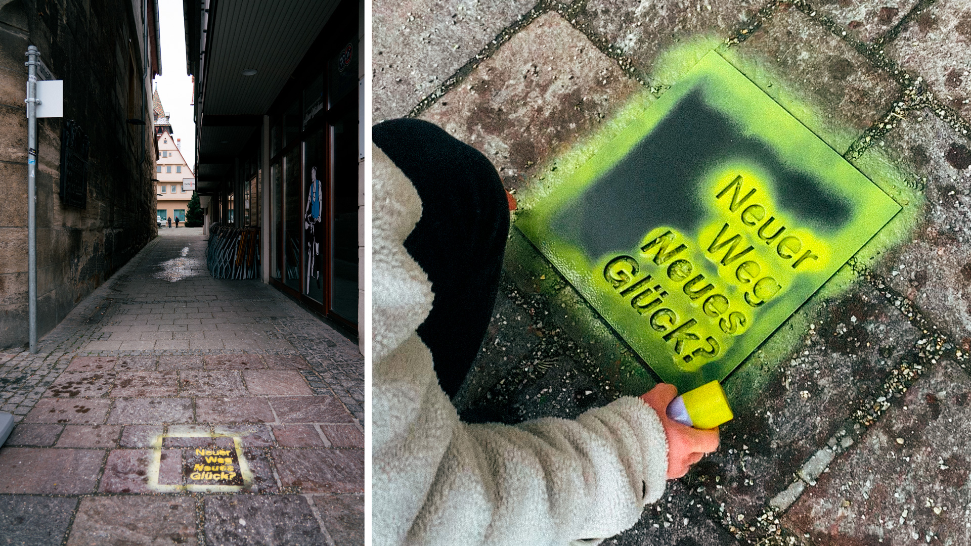 Um die Frequenz in den Seitengassen zu erhöhen, entwarfen wir verschiedene Schablonen mit Slogans, wie “Neuer Weg, neues Glück?”, “Neue Schätze entdecken?” oder “Heute schon flaniert?”. Diese wurden mit abwaschbarer Kreide auf die Fußgängerzonen von Schwäbisch Gmünd gesprüht. Um einen Wiedererkennungswert zu den bisherigen Aktionen zu erzielen, nutzten wir das Layout unseres Logos als Entwurfsvorlage für die Schablonen. Neben der Entdeckung von kleinen unscheinbaren Geschäften erwies sich die Aktion auch auch als hilfreich, um Anwohner und Besucher auf unsere Leerstandsbespielungen aufmerksam zu machen.