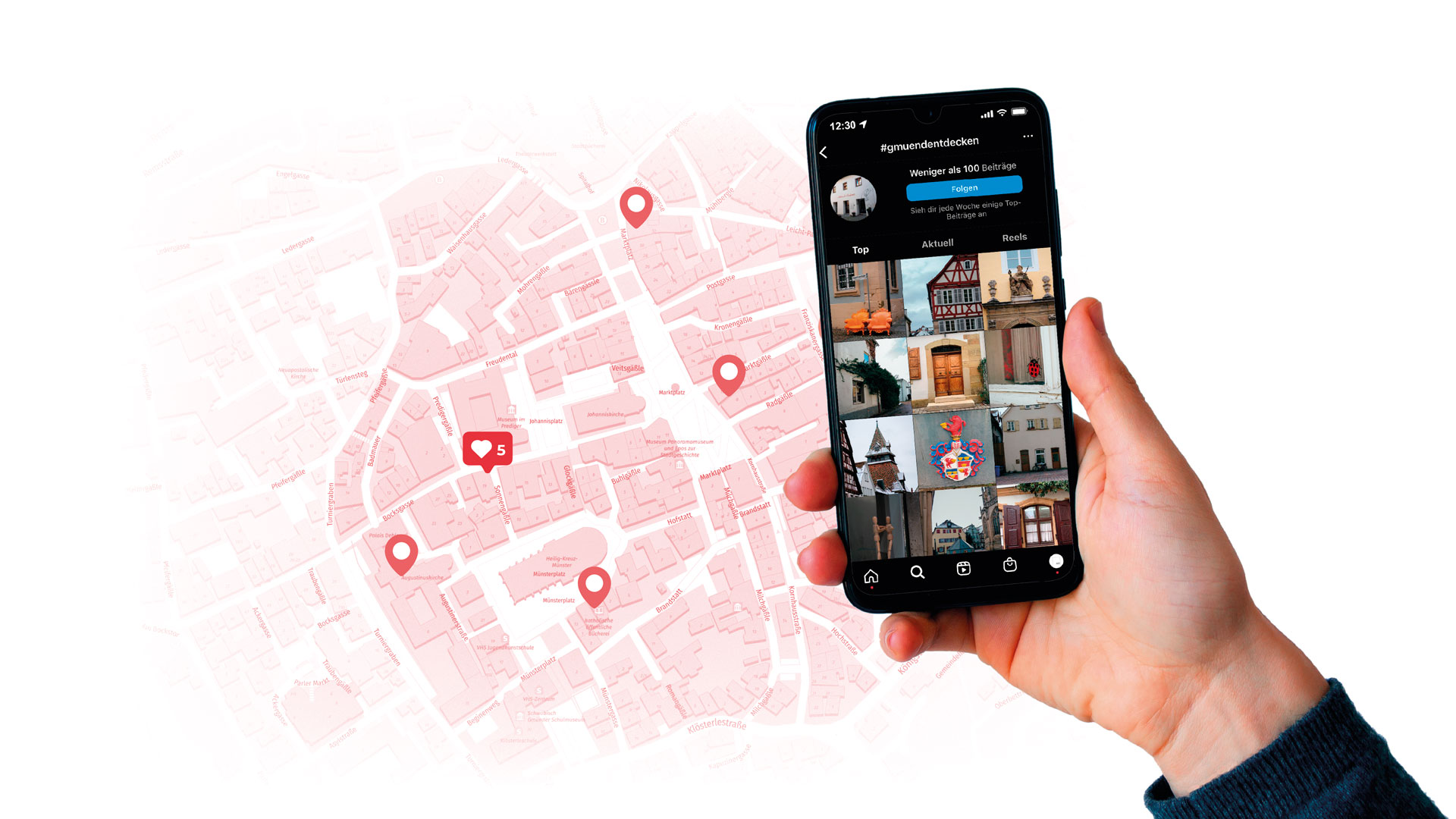 Unter dem Hashtag #gmuendentdecken riefen wir zum Teilen schöner und verborgener Orte der Gmünder Innenstadt auf. Dabei konnte es sich beispielsweise um den beneidenswerten Ausblick aus dem Fenster oder um einen schönen Ort handeln, den man beim Flanieren entdeckt hat. Zu jedem Foto konnten die Bewohner auch eine kurze Beschreibung anhängen oder uns eine Audioaufnahme schicken. Die gesammelten Fundstücke wurden in einer "interaktiven Schatzkarte" zusammengetragen. Auf diese Weise konnten wir die Bewohner Schwäbisch Gmünds spielerisch in die Innenstadt locken und die sonst wenig besuchten Seitenstraßen wiederbeleben. Um auf die Kampagne auch in der Offline-Welt aufmerksam zu machen, wurde diese Aktion mit der Kreide-Aktion verknüpft. Die gesammelten Fotos und Texte können in Zukunft Teil einer Ausstellung im Leerstand werden.