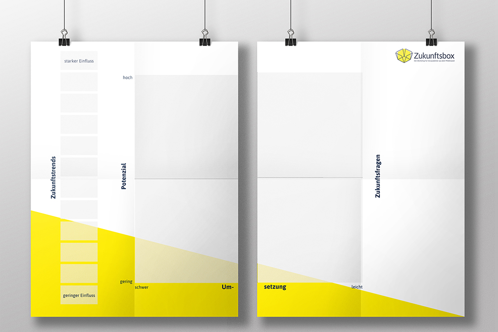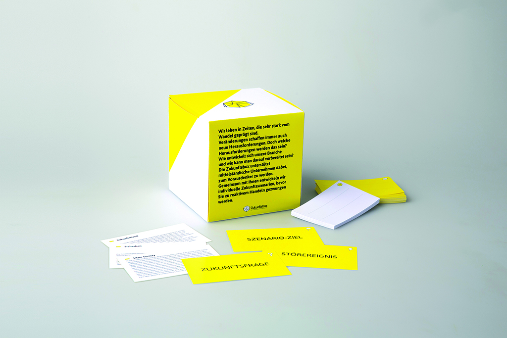 Mit der Zukunftsbox wird mittelständischen Unternehmen ein einfaches Werkzeug an die Hand gegeben, mit denen sich diese mit individuellen Zukunftsfragen auseinandersetzen können. Durch die einfache Anwendung von Methoden der Zukunftsforschung werden in einem Workshop individuelle Zukunftsszenarien entwickelt. Die Zukunftsbox beinhaltet alle Materialien, welche zur Szenarienentwicklung innerhalb des Workshops benötigt werden.